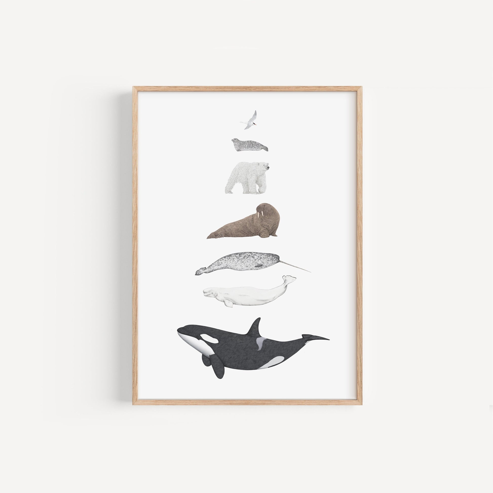 Drawing of Arctic wildlife. An Arctic tern, ringed seal, polar bear, Pacific walrus, narwhal, beluga whale and an orca. Available in A5 (210 x 148 mm), A4 (297 x 210 mm) and A3 (297 x 420 mm).