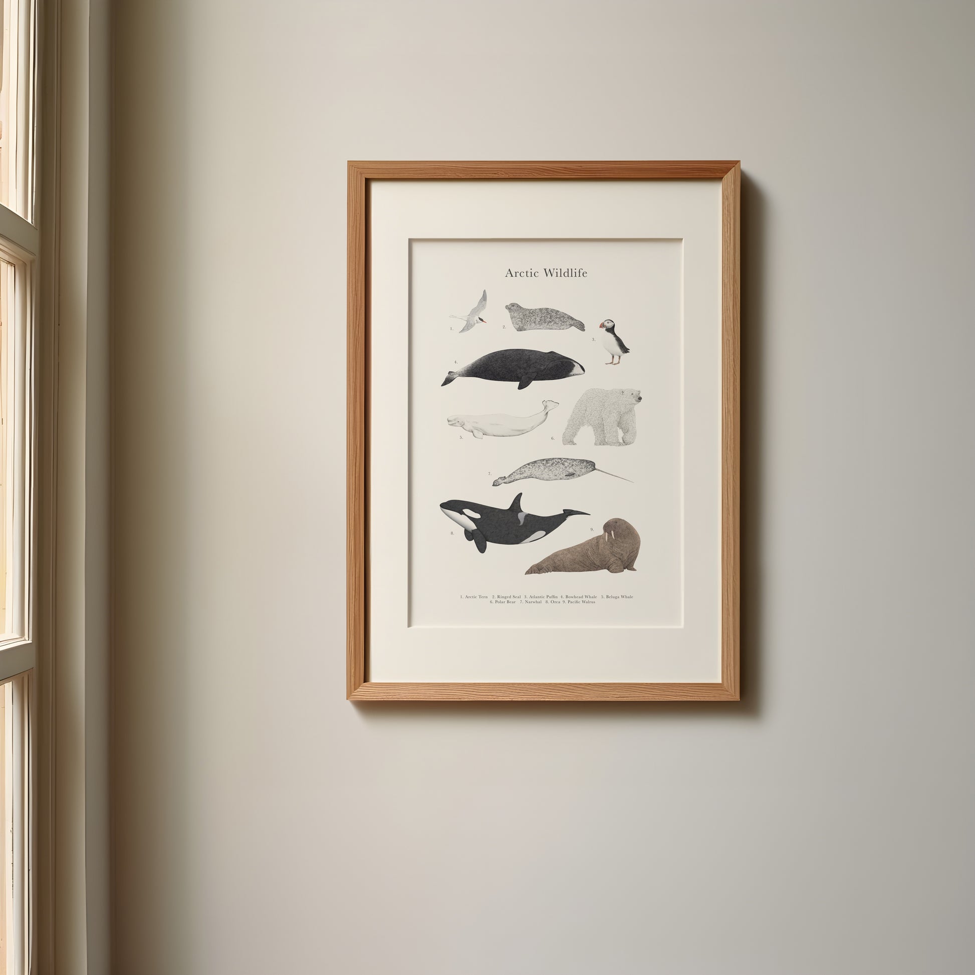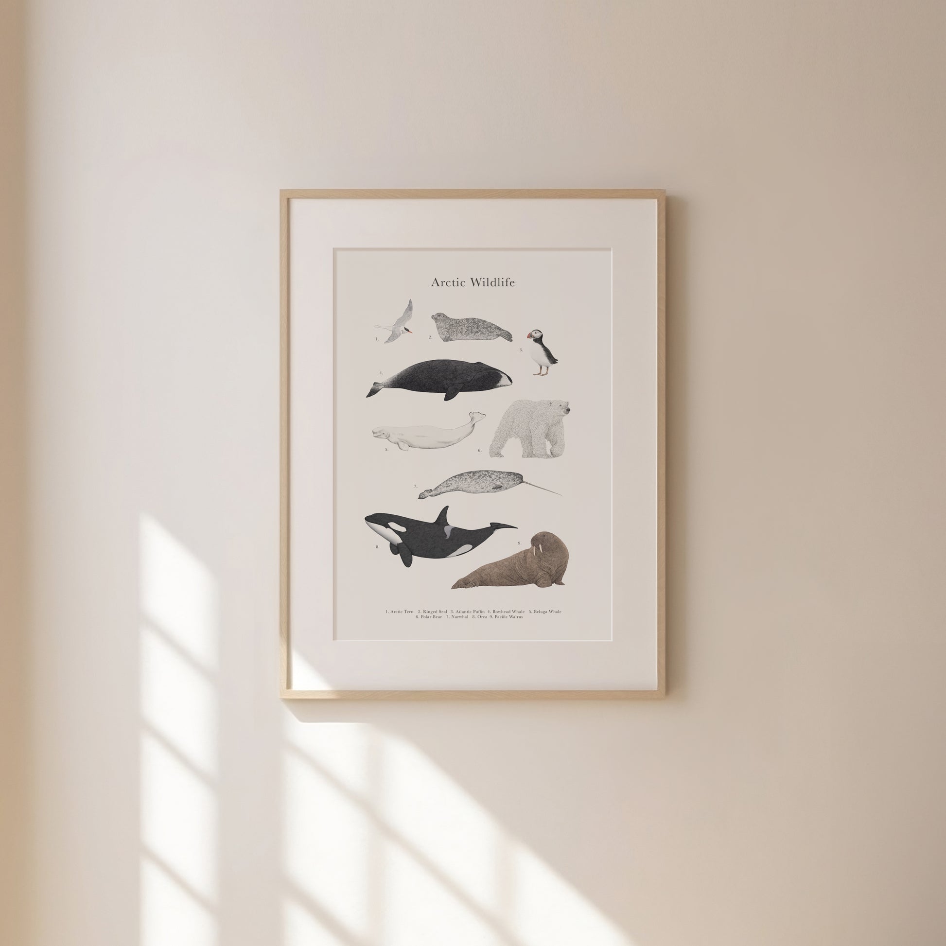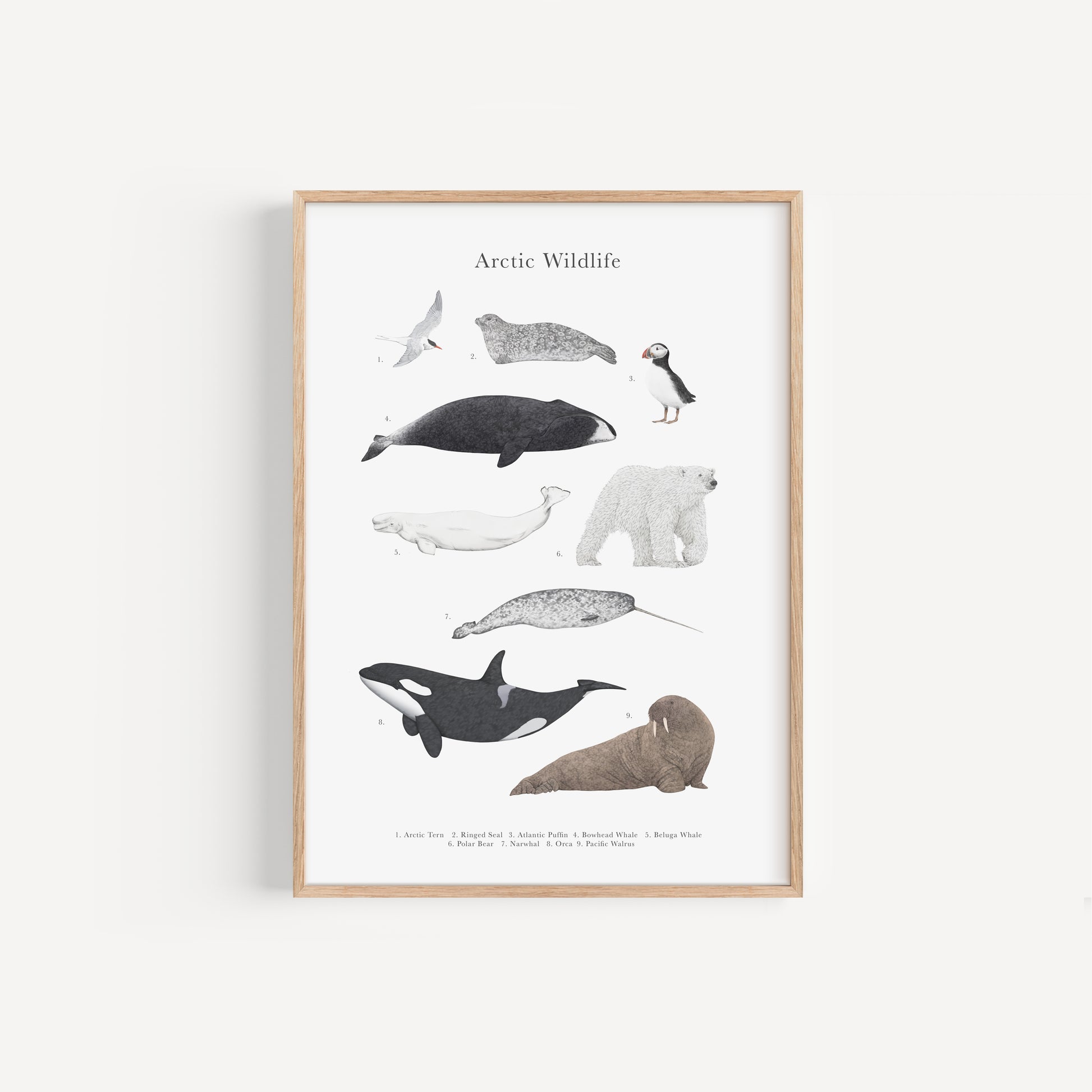 Collection of 9 Arctic wildlife species. Originally drawn in pencil and coloured digitally.