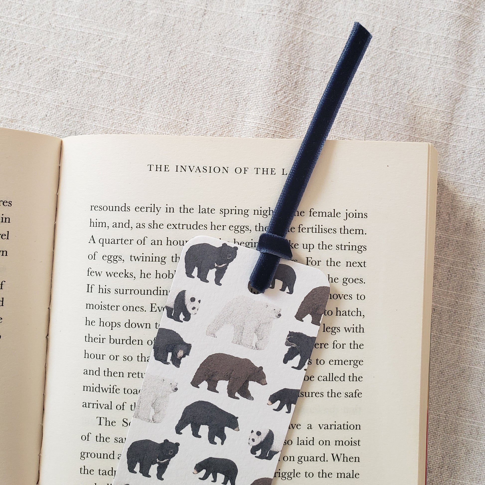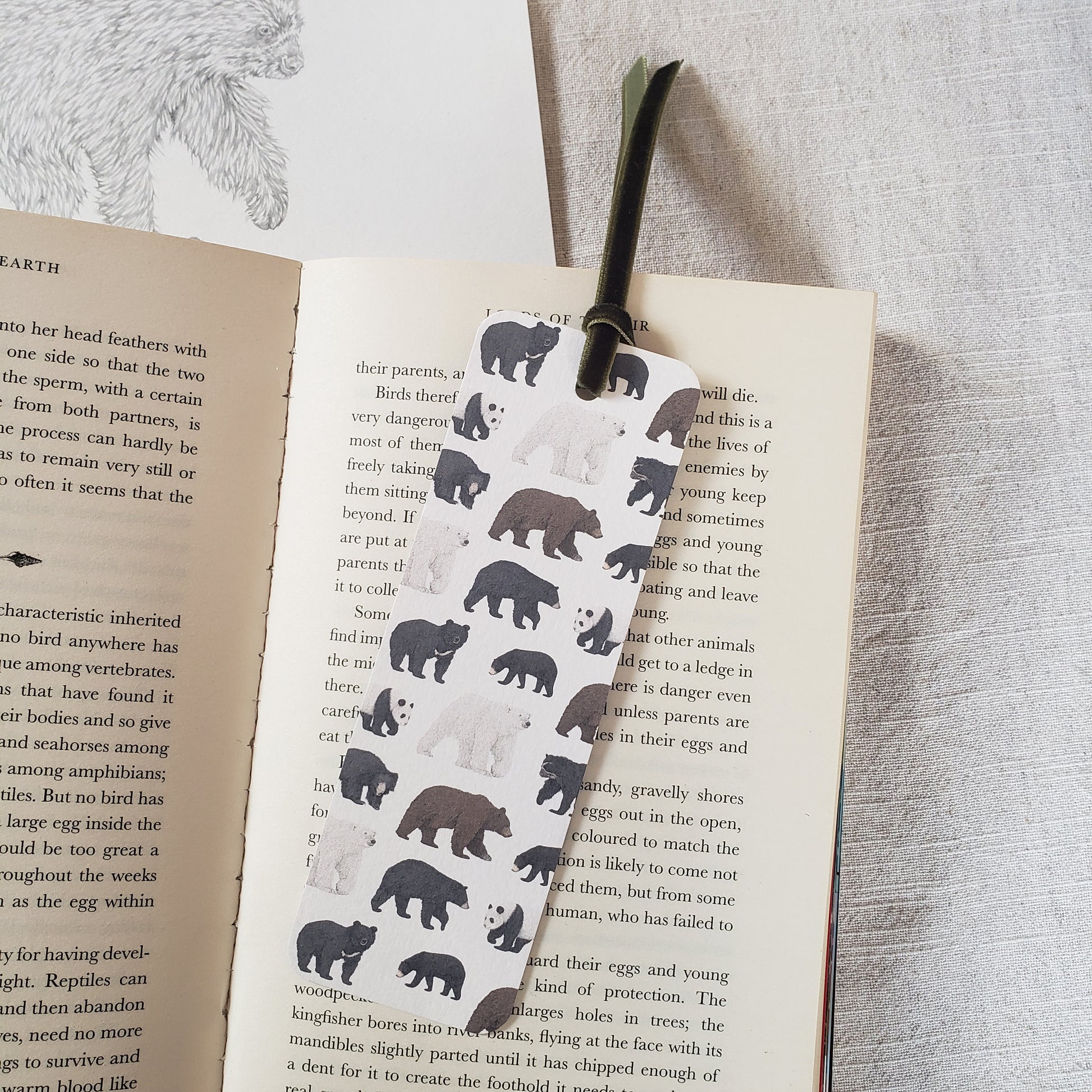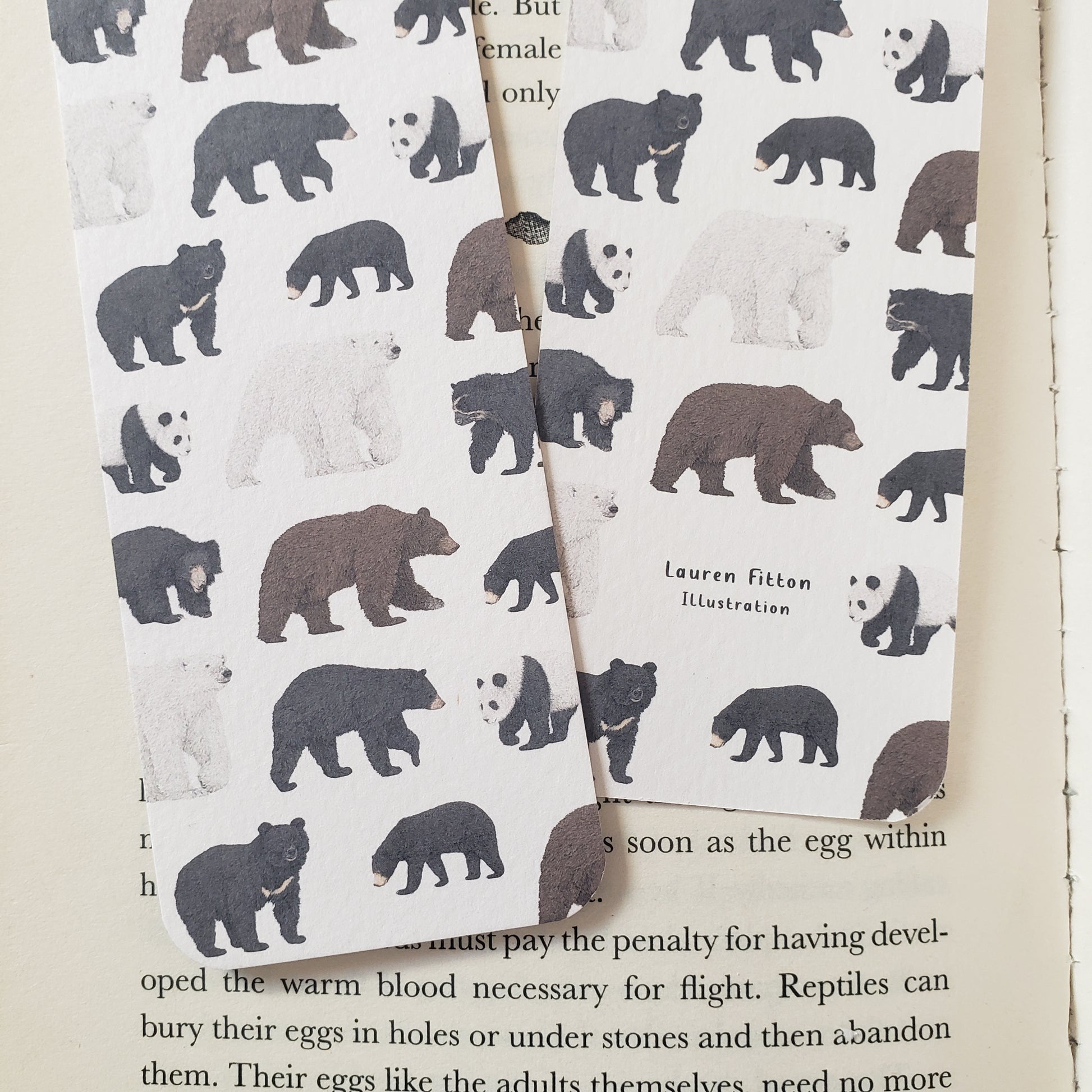 This bookmark features a pattern of bear species on the front and back with a small logo on one side.
