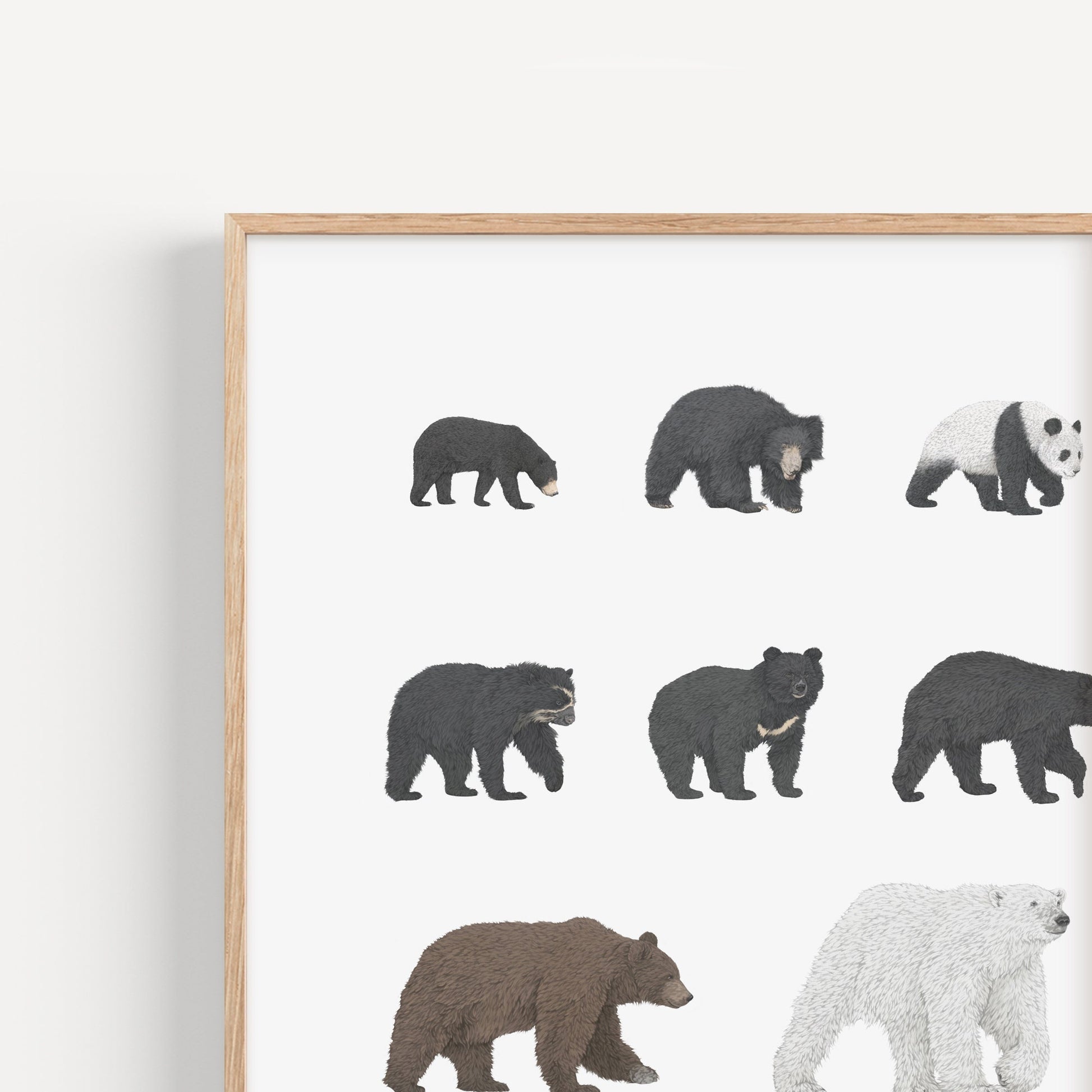 Drawing of all 8 species of bear. Available in various sizes, 210 x 210mm and 297 x 297mm.