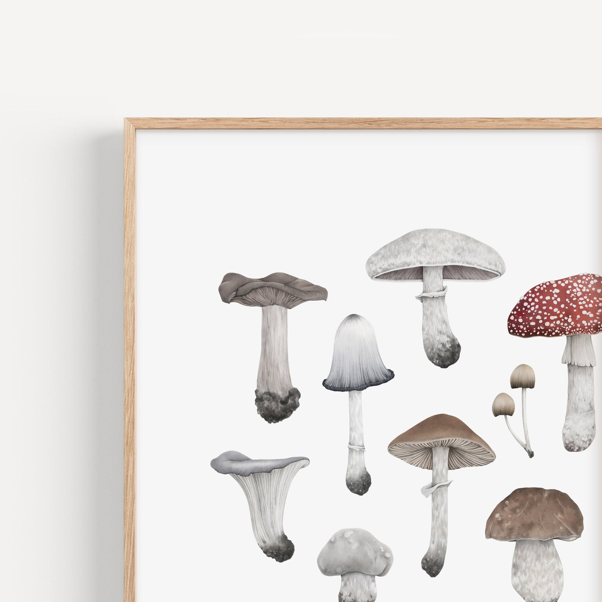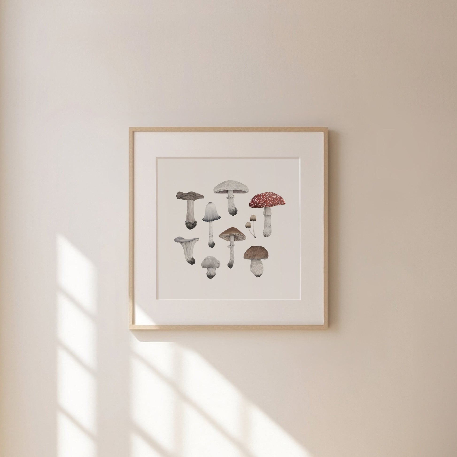 Drawing of 9 British mushroom species. Available in 210 x 210mm and 297 x 297mm.