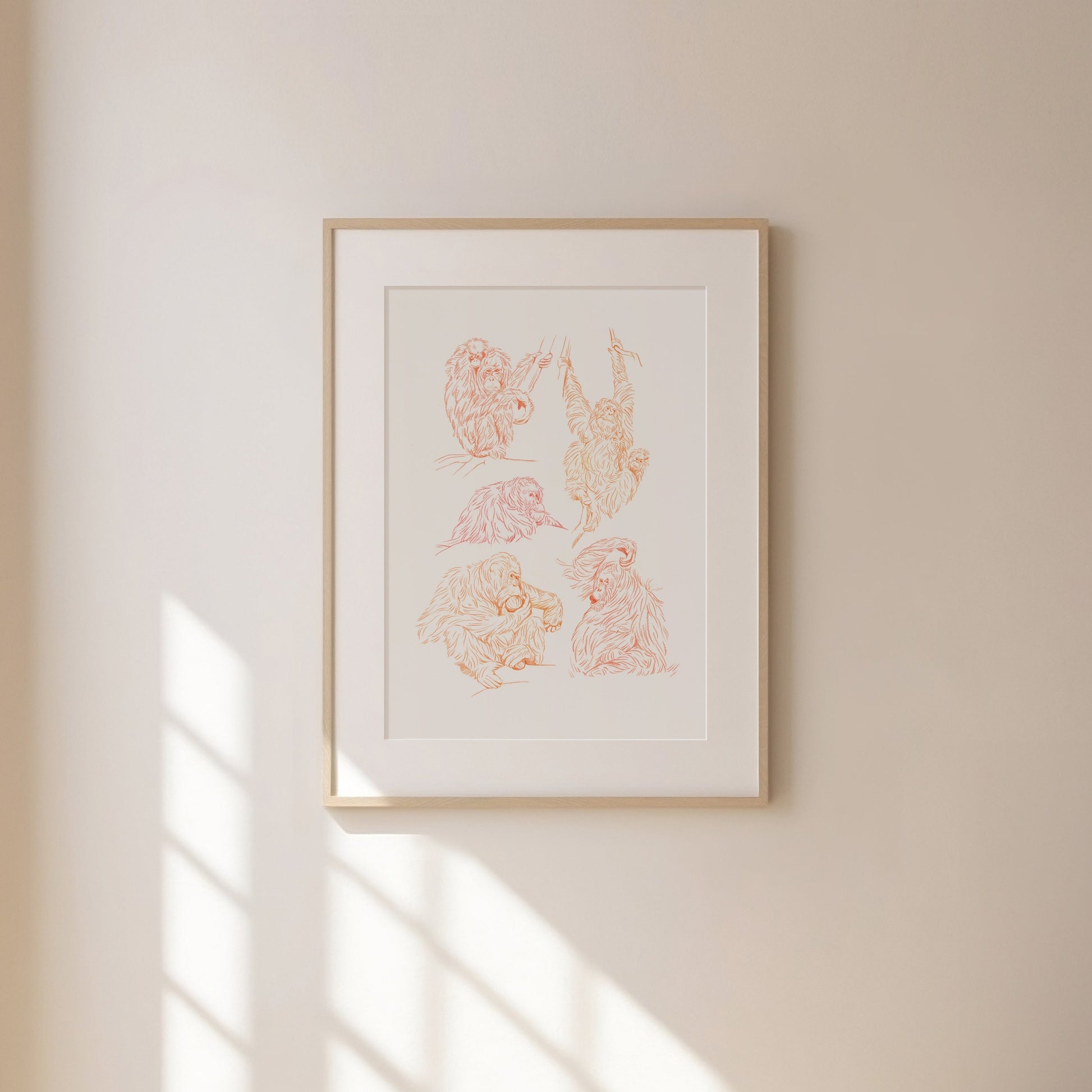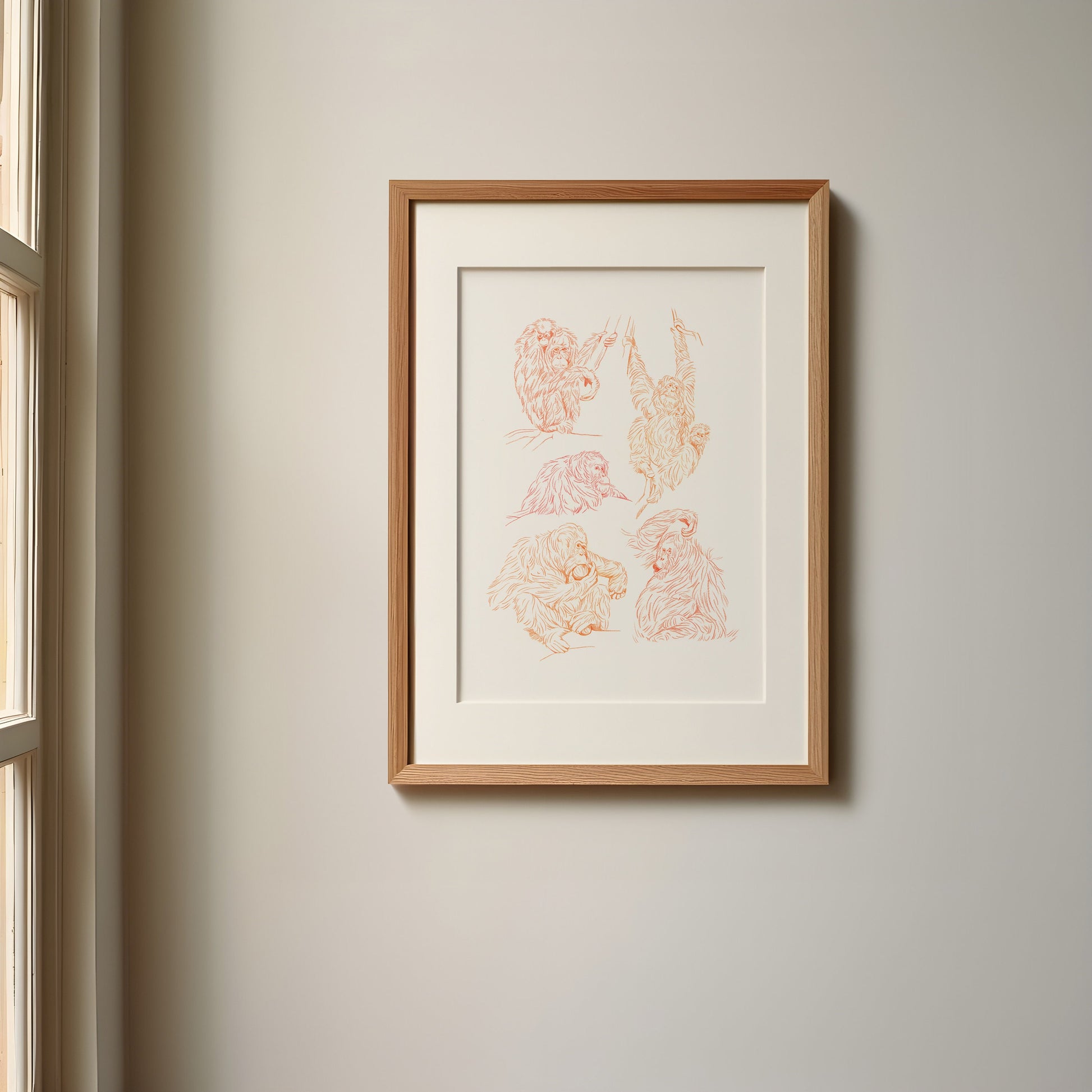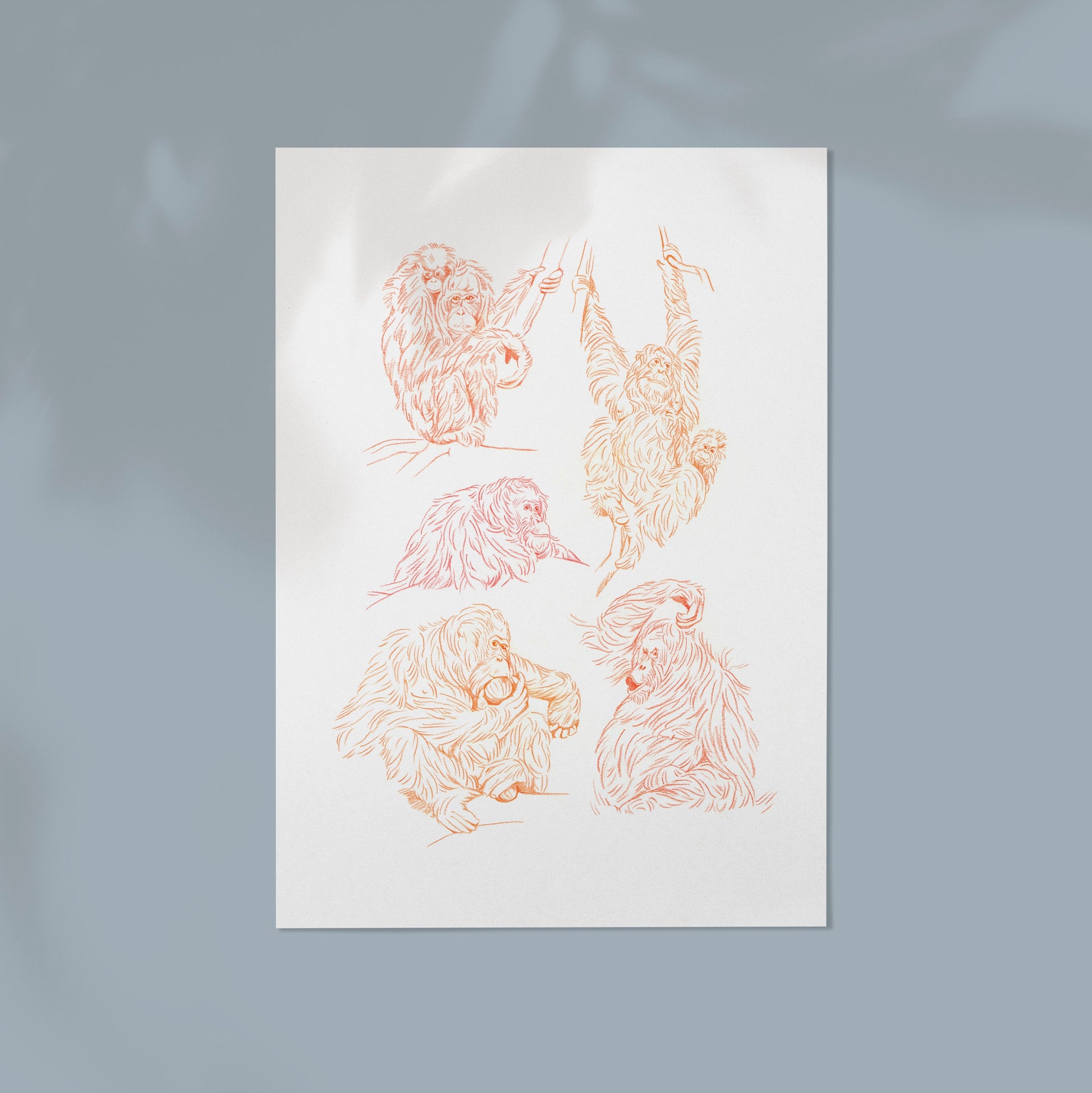 Orang-utan sketches. Originally drawn using coloured pencils. Available in A5 (210 x 148 mm) and A4 (297 X 210 mm).