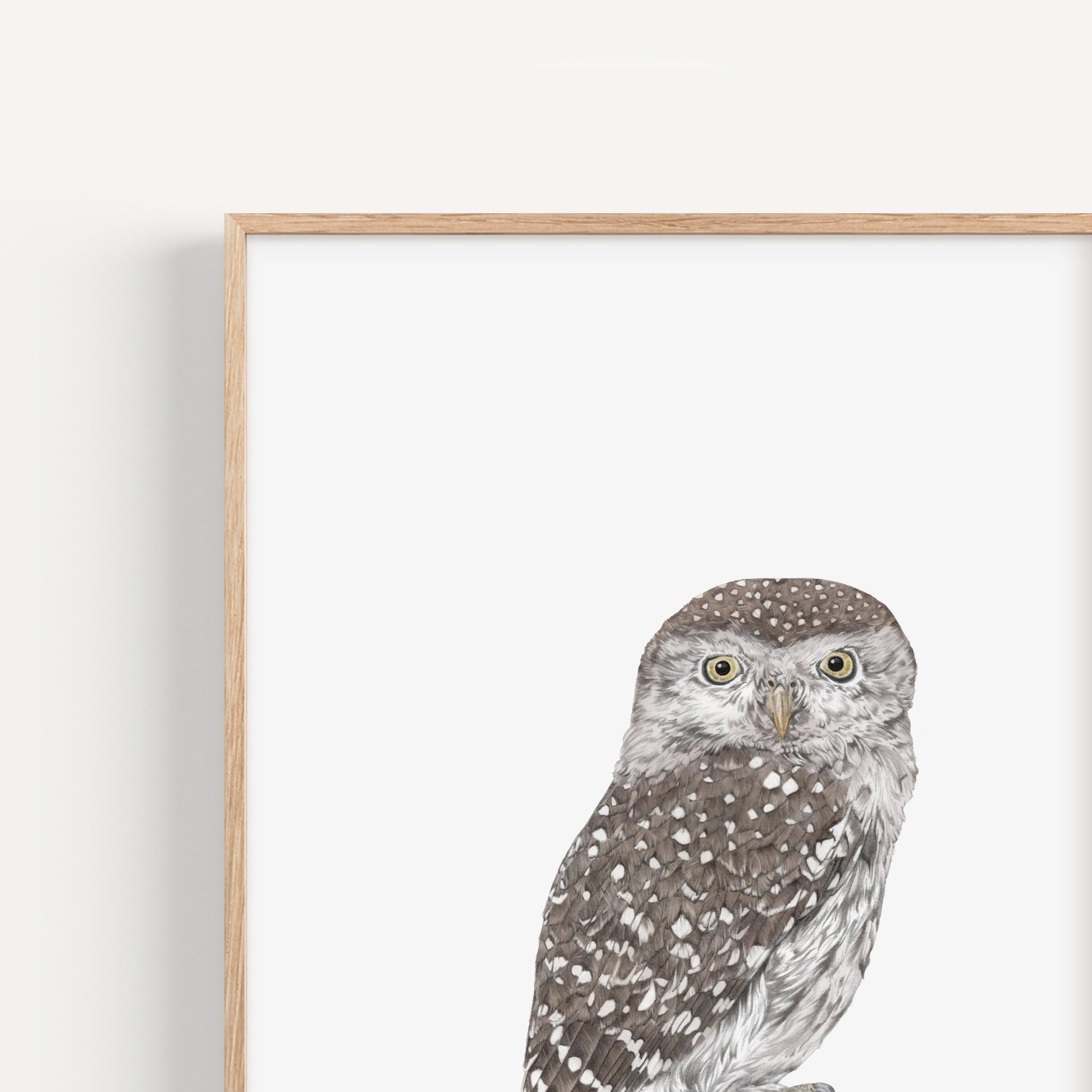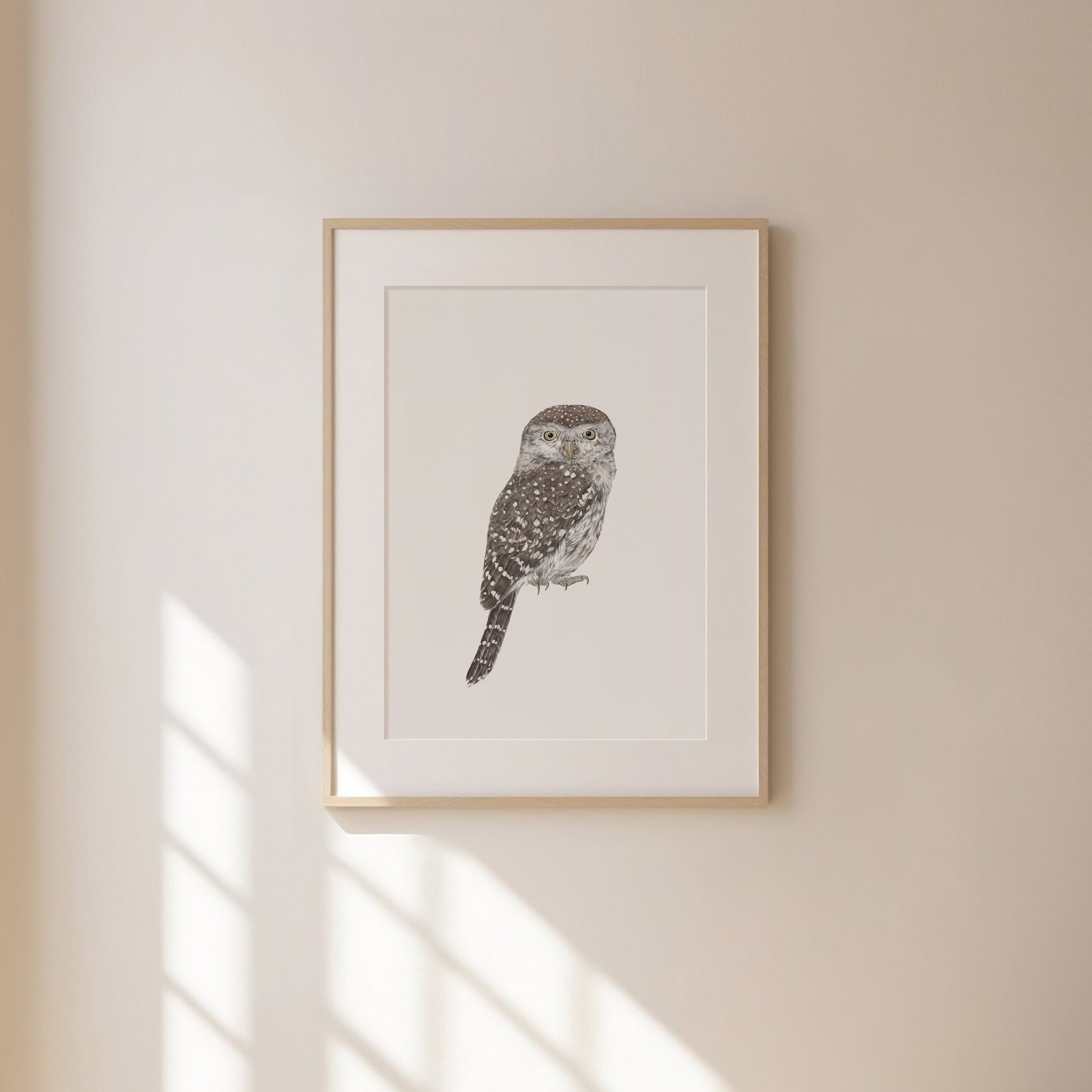 Drawing of a Pearl spotted owlet. Available in A5 (210 x 148 mm) and A4 (297 X 210 mm).