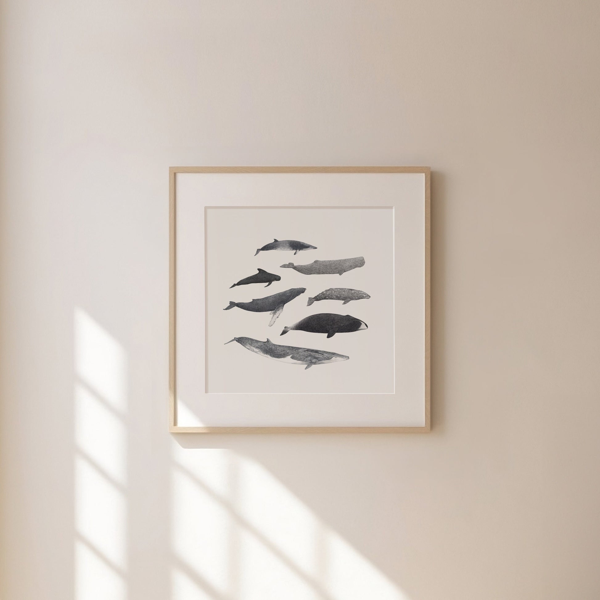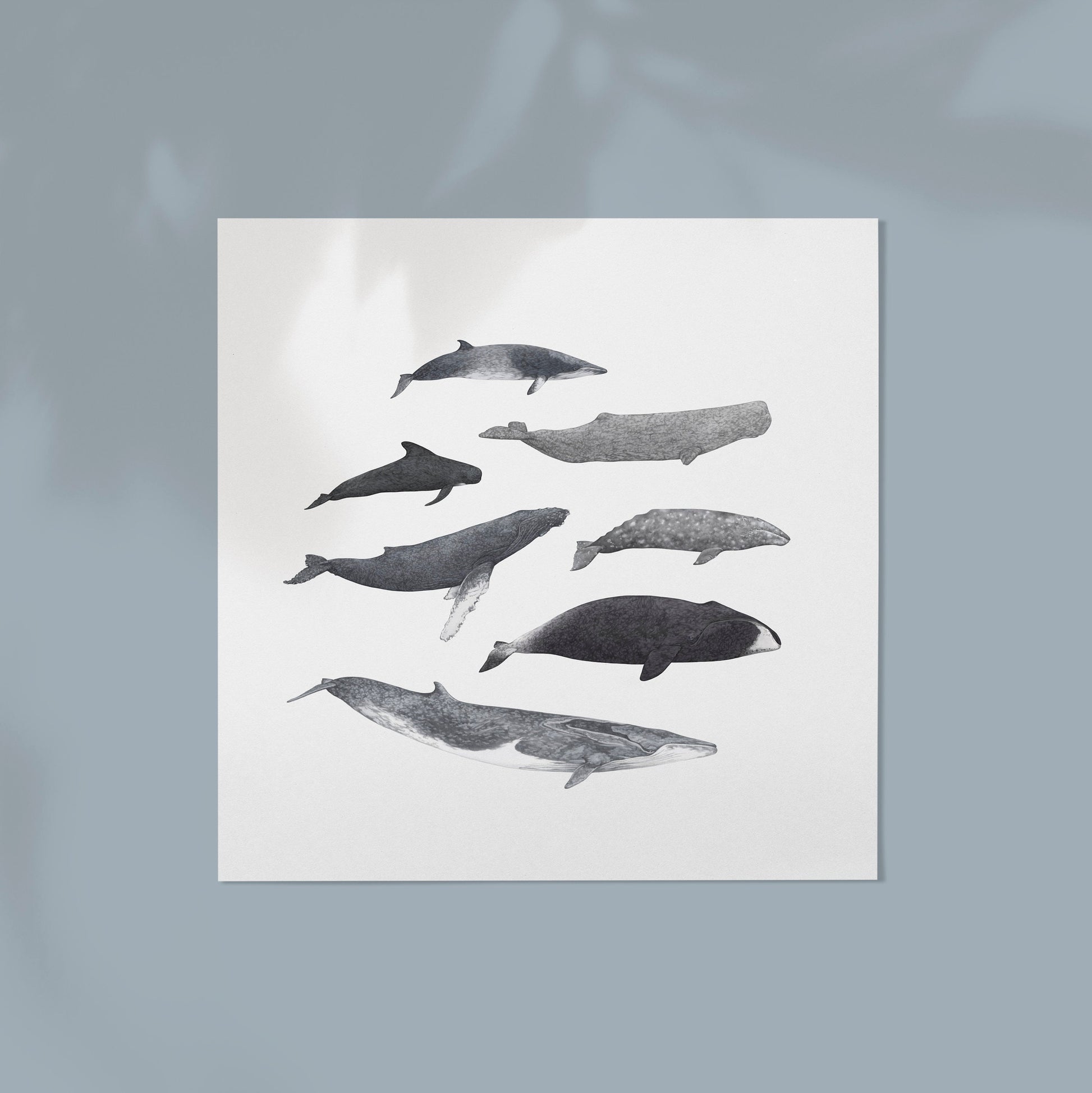 Drawing of 7 species of whale. Pilot, Minke, Grey, Sperm, Humpback, Bowhead and Fin Whale. Available in 210 x 210mm and 297 x 297mm.