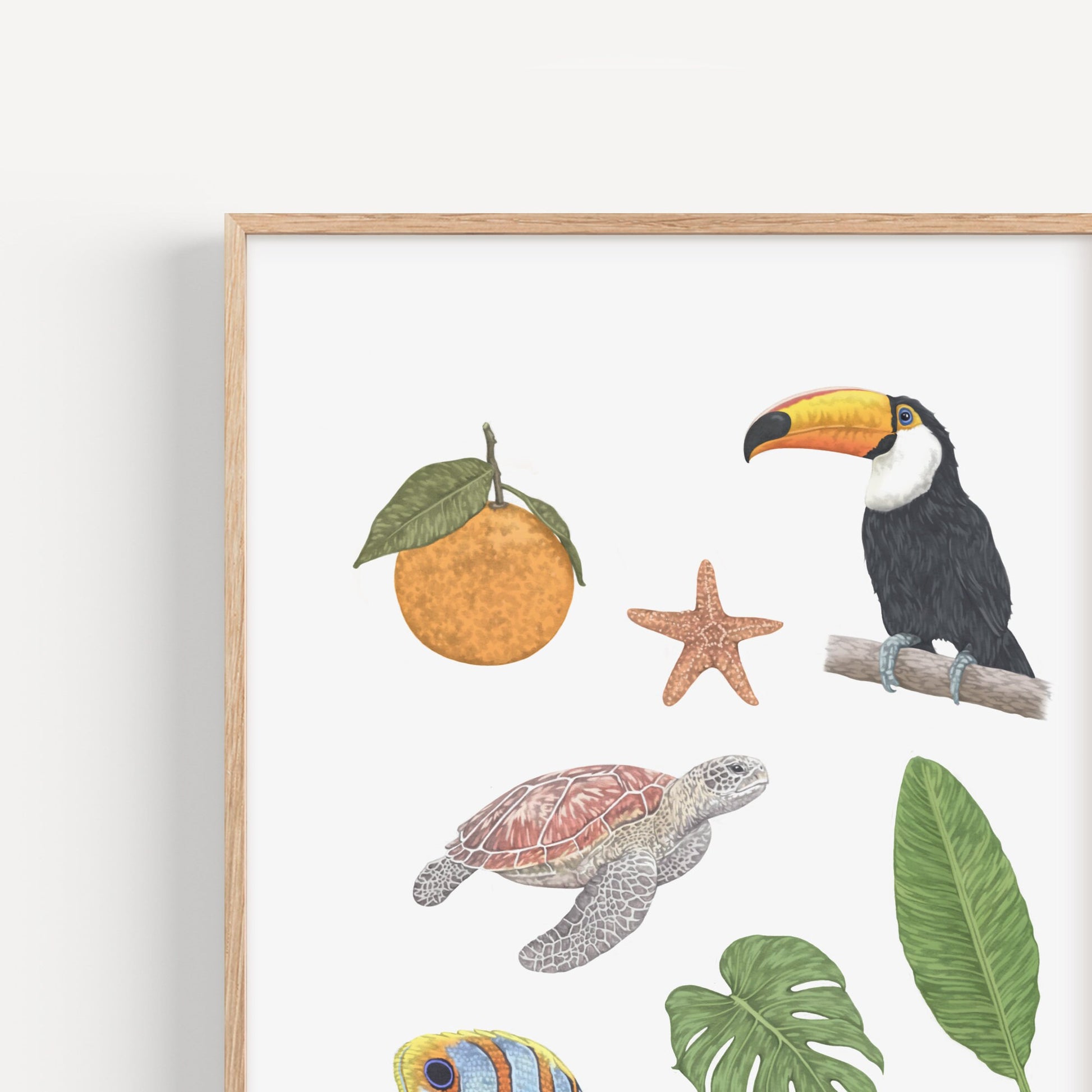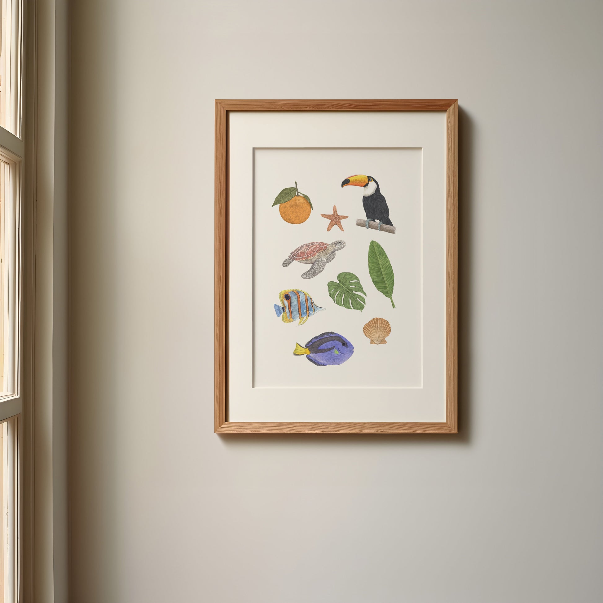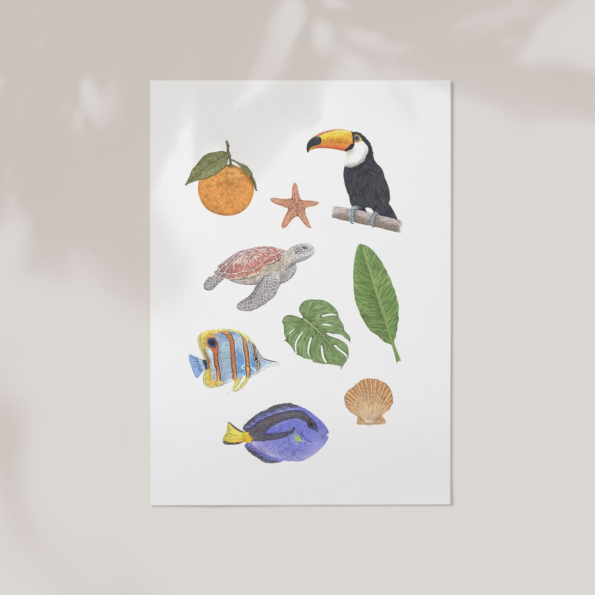 Print of tropical items and species. Available in A5 (210 x 148 mm) and A4 (297 X 210 mm).