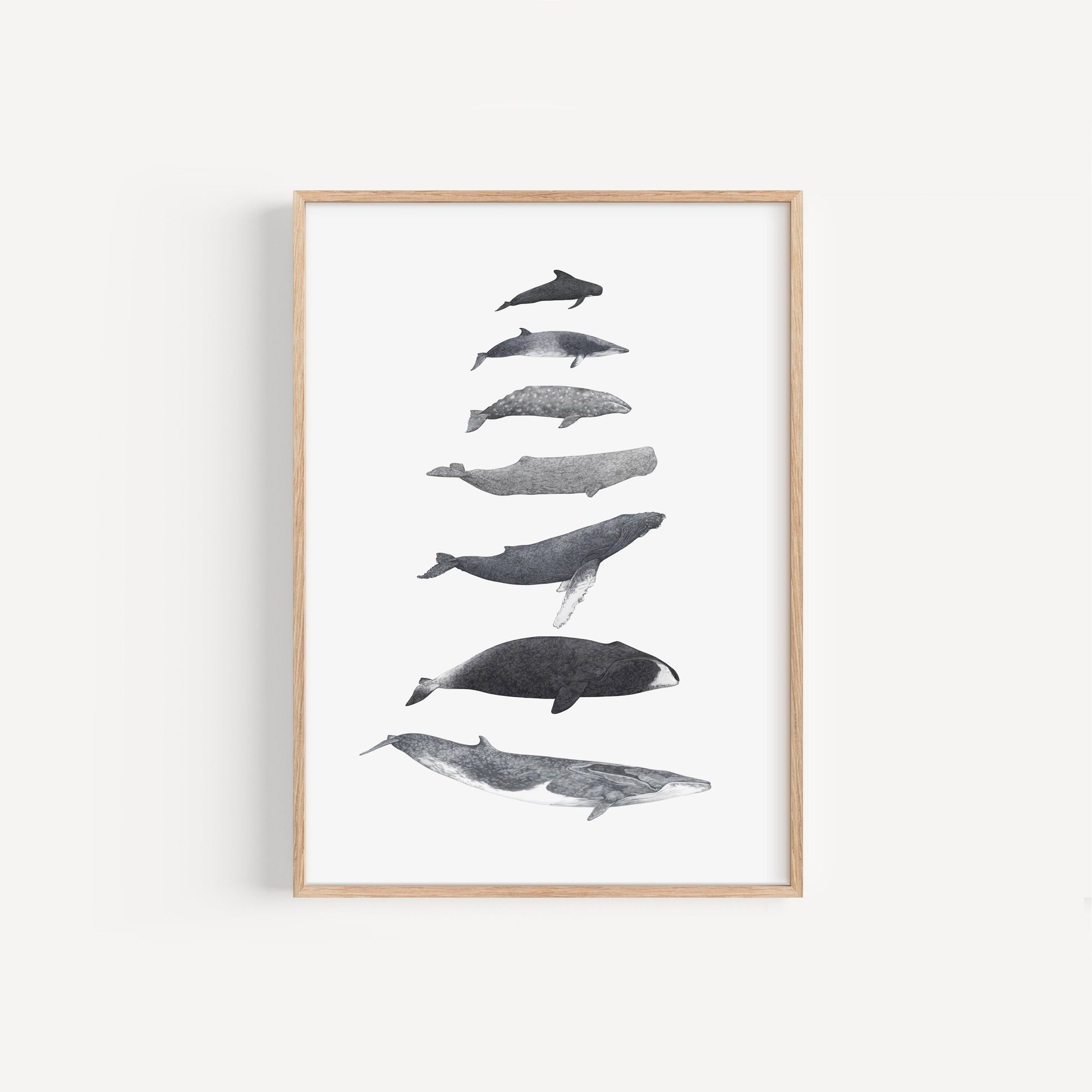 Drawing of 7 species of whale. Pilot, Minke, Grey, Sperm, Humpback, Bowhead and Fin Whale. Available in A5, A4 and A3.